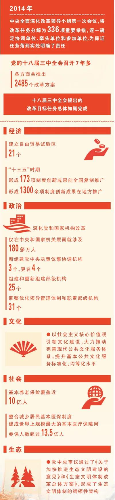 翻开这份决定,从以经济体制改革为主到全面深化经济、政治、文化、社会、生态文明体制和党的建设制度改革,是新中国成立以来最为全面系统的改革部署。