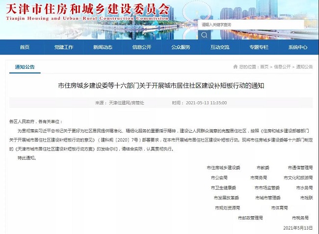 为进一步提升居住社区质量,完善居住社区配套设施,天津开展城市居住社区建设补短板行动。日前,天津市住房城乡建设委等16部门制定了《天津市城市居住社区建设补短板行动方案》。