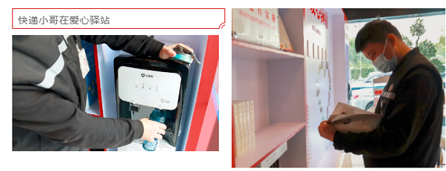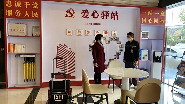 在爱心驿站在提供饮水、共享充电宝的基础上,粤华集团完善了大厦整体红色氛围,增加了《习近平谈治国理政》等红色书籍;设置党建百宝箱,为红色快递提供党旗、国旗、党徽、入党誓词等“一箱一活动”的红色服务;配置爱心药箱,内设创可贴、碘酒、云南白药等药品,为快递小哥提供应急处理的服务。粤海集团大厦党员积极参加志愿者服务,让点滴之力汇成“心”型,用真心用真情将爱心驿站建设成同行的温馨港湾。