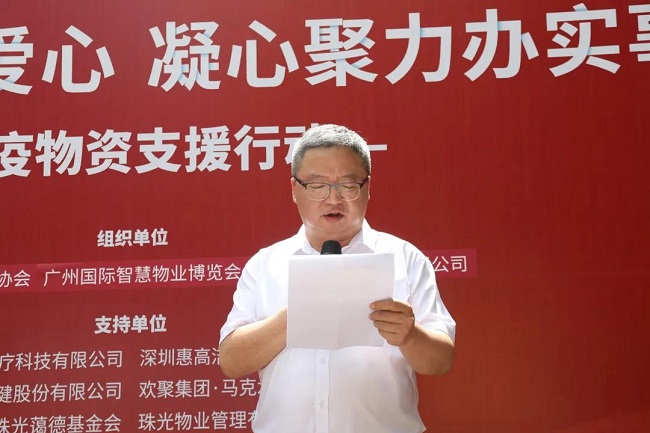 李永新会长发言表示:我们联合广州物博会及旭杨国际共同举办本次“’不容辞献爱心·凝心聚力办实事抗疫物资支援主题活动,得到业界广泛响应。截止到616日,广州物协已发起并筹集三批抗疫物资支援一线,带领700余家会员单位、逾20余万从业人员奋战在全市6000余个住宅小区的疫情防控现场,组建了近万人次的物业志愿者,配合社区做好疫苗接种、核酸检测及封闭管理区域的各项抗疫应急工作。今天,我们将再度出征,并联合我们副会长单位、物业行业产业链上下游各大企业一起定向为芳村新冠疫情封闭区域、广州市第八人民医院及中山大学附属医院内的物业服务企业驰援,并第一时间给一线工作人员带去来自行业的慰问信和慰问物资,传递行业温暖,与物业服务企业共守抗疫一线!