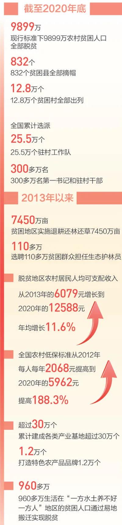 2020年至2021年年初,21万多名普查人员对中西部22个省(区、市)开展了国家脱贫攻坚普查。普查结果显示,现行标准下农村贫困人口全面实现了脱贫。