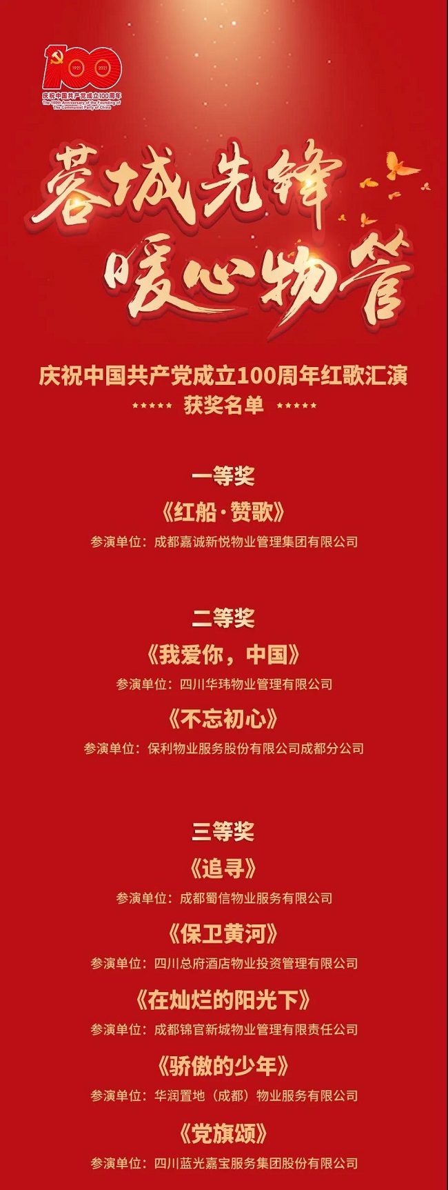 汇演活动在表达广大蓉城物业人初心情怀的歌舞《物说新语•蓉城幸福美好生活贴心人》中落下帷幕。经过激烈地角逐,成都嘉诚新悦物业管理集团有限公司选送的《红船•赞歌》获得一等奖;四川华玮物业管理有限公司《我爱你,中国》,保利物业服务股份有限公司成都分公司《不忘初心》获得二等奖;成都蜀信物业服务有限公司《追寻》,四川总府酒店物业投资管理有限公司《保卫黄河》,成都锦官新城物业管理有限责任公司《在灿烂的阳光下》,华润置地(成都)物业服务有限公司《骄傲的少年》,四川蓝光嘉宝服务集团股份有限公司《党旗颂》获得三等奖;鑫苑科技服务集团有限公司成都分公司《十送红军》,雅生活智慧城市服务股份有限公司成都分公司《心中的歌》,成都威斯顿经营管理有限责任公司《在太行山上》,成都泓济物业服务有限责任公司《江山》,中铁建物业管理有限公司成都分公司《祖国不会忘记》获得优秀奖;中海物业管理有限公司成都中海振兴分公司、成都嘉诚新悦物业管理集团有限公司获得风采展示奖。