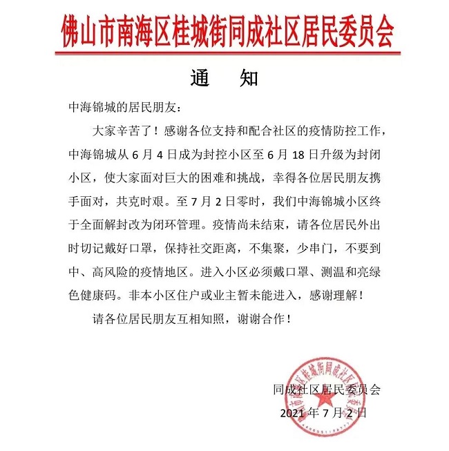 6月17、18日,佛山连续报告新增本土确诊病例:中海锦城3街3栋一位业主确诊,而该栋业主转移至隔离酒店后再验出一名阳性,佛山连续13天“0”确诊记录被打破,中海锦城立即由封控管理紧急转为全封闭管理,时间暂定为6月18日-7月2日。