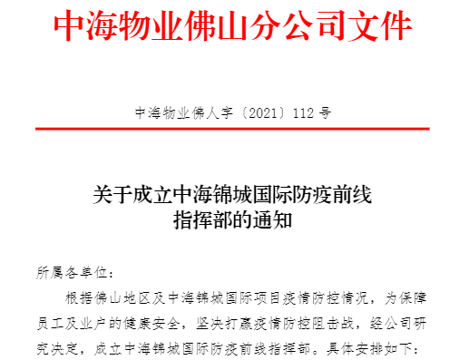 ▲中海物业佛山公司紧急成立中海锦城国际防疫前线指挥部