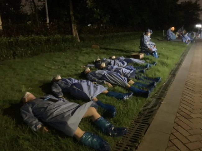 高温加上长时间高强度工作,不少工作人员在派送完物资后,累得直接瘫倒在园区各处,席地休息。
