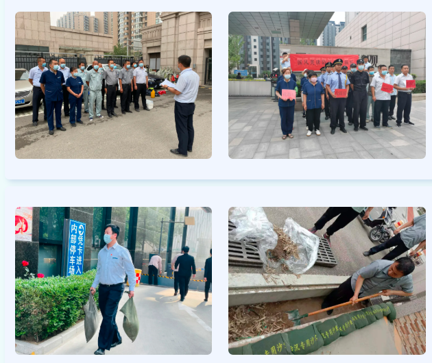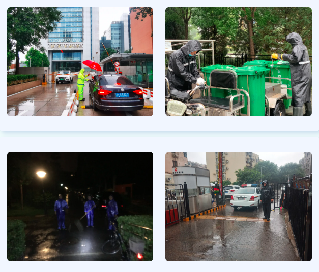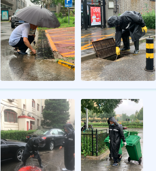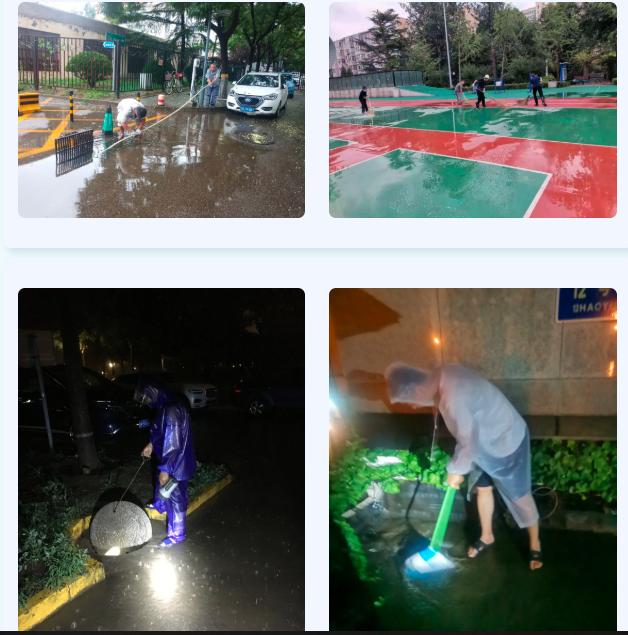 哪里有堵点,漏点,我们就出现在哪里!各项目集中针对园区中的低洼和易积水点、地下停车库等区域加大巡视力度,同时加派专人盯防,对已经形成和可能会出现的积水地段进行及时的排积和清淤,确保园区无明显积水区域,保障业主的生命、财产及出行安全。