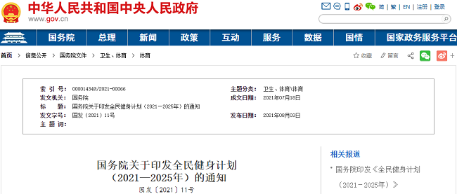 国务院:2021年-2025年新建或改扩建2000个以上体育公园、全民健身中心、公共体育场馆等健身场地设施