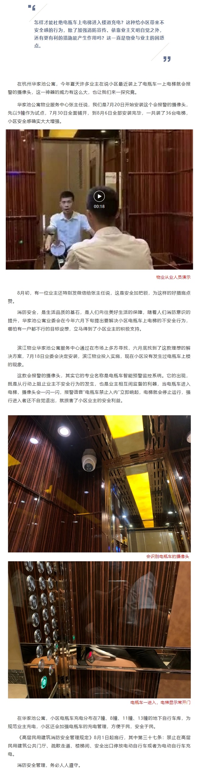 滨江物业:电瓶车一上电梯会报警!这家小区业主特有安全感