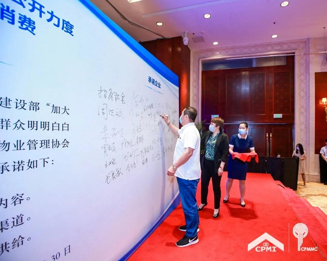 中国物协副会长、广州粤华物业有限公司董事长李健辉宣读《“加大物业服务收费信息公开力度 让群众明明白白消费”承诺书》,60家品牌物业服务企业积极响应中国物协倡议,签署承诺书,从“公开物业服务收费信息内容、畅通物业服务信息监督渠道、增加优质物业管理服务供给”等方面作出庄严承诺,自觉接受群众监督。