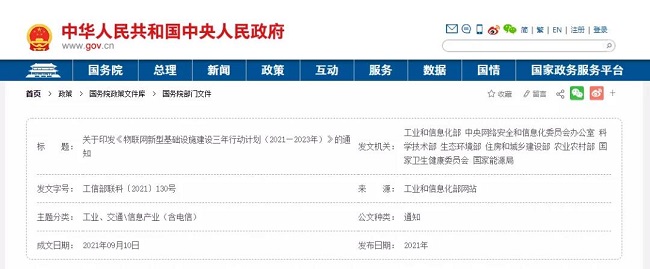 关于印发物联网新型基础设施建设三年行动计划(2021-2023年)的通知