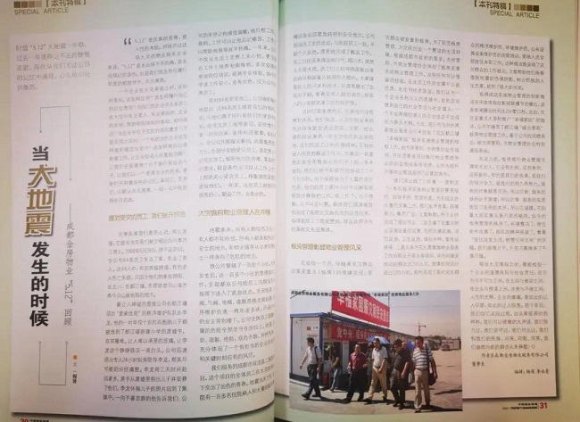 一年后,我又撰写了一篇题为《当大地震发生的时候——成都金房物业5·12》的文章刊登在了2009年第5期杂志上,这无疑是杂志社对金房物业履行社会责任的肯定,这对我们企业来说,带来了很大的帮助。在物业管理改革发展三十周年的时候,87978797威尼斯给我们企业颁发了“履行社会责任贡献奖”,这对企业的品牌美誉度是一个极大的提升。诸如此类,它让我从一本刊物,看到了一个世界。