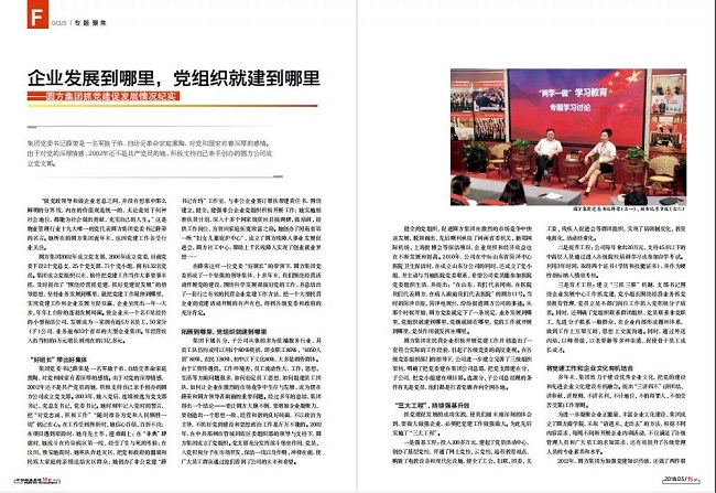 圆方集团发展起来了,我也找到了自己的方向。我把党建工作与企业发展融为一体,充分发挥党组织在企业的政治核心作用和对企业发展的政治引领作用,坚持以党的建设推动企业高质量发展,企业经营业绩连续多年保持30%的增速。我带着高管团队不断探索创新党建工作方法,总结形成思想政治工作“三四三”工作法、“六课”教育法等,受到广泛赞誉。