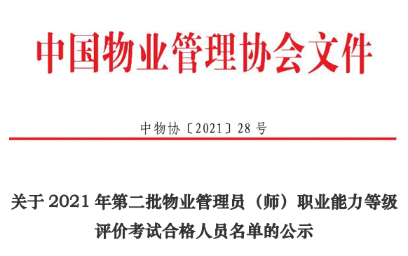 (中物协【2021】28号)关于2021年第二批物业管理员(师)职业能力等级评价考试合格人员名单的公示