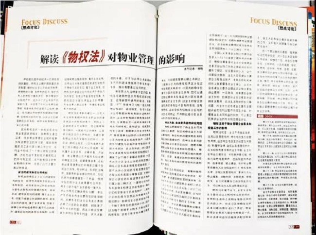 2007年3月16日,《物权法》在全国人大通过。之后,杂志多次开展“《物权法》对物业管理的影响”专题约稿,组织“关注《物权法》 学习《物权法》”主题征文,召开“《物权法》与物业管理专题座谈会”,邀请业界法律专家分析解读《物权法》出台对物业管理行业的影响,引导全行业正确认识、准确解读《物权法》的有关规定。这些专题报道文章对全行业深入学习贯彻《物权法》及推动行业规范健康发展起到了积极的推动作用。