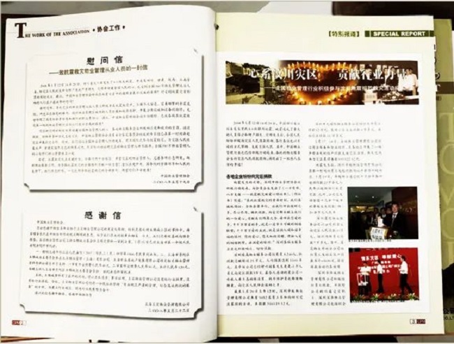 2008年5月,汶川大地震发生后,物业管理行业积极投身抗震救灾,杂志推出“心系汶川灾区 贡献行业力量”系列报道,深入报道各地物业服务企业积极向灾区捐款、部分物业人深入灾区开展救援以及各地物业服务企业积极慰问川籍受灾员工的先进事迹,宣传物业管理行业在安置受灾群众及为灾区重建所做的贡献,受到了行业的广泛关注。这一系列报道有力地弘扬了物业管理行业积极承担社会责任的崇高形象,为行业健康发展营造了良好的舆论环境。