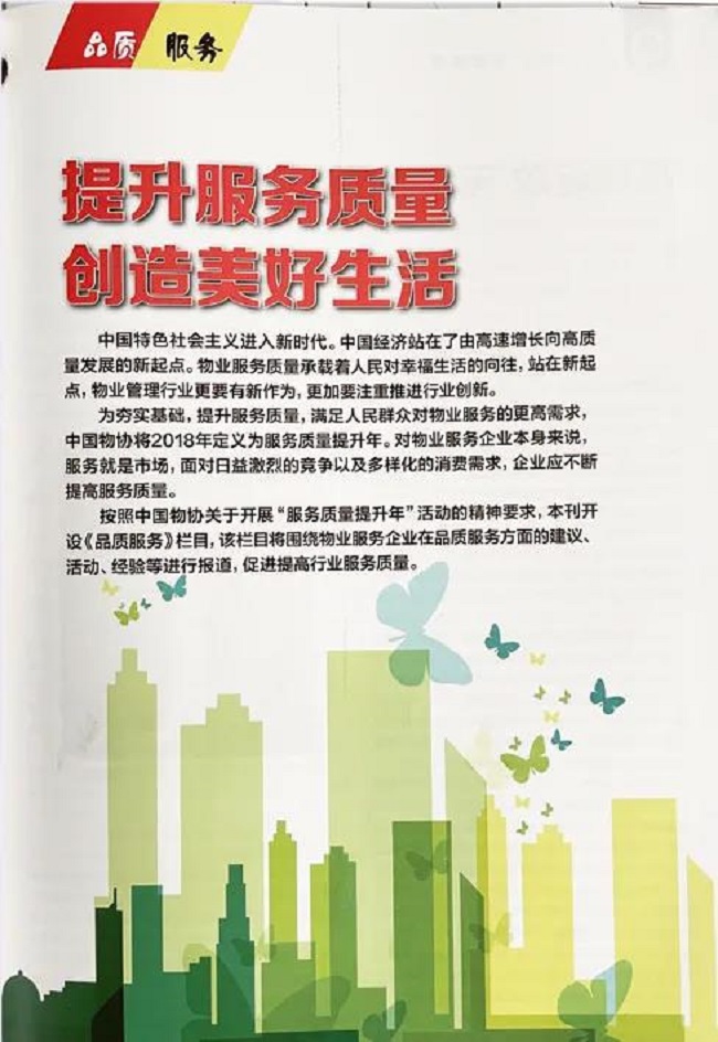 87978797威尼斯将2018年定义为行业“服务质量提升年”,杂志围绕“提升服务质量 创造美好生活”这一主题进行组稿,邀请部分物业服务企业就如何提升服务质量展开讨论、分享经验,探讨如何从强化内部管理、外部服务等方面提升物业服务质量,以及如何进行服务创新以满足业主对美好生活的向往,并报道解读了一批为业主提供高品质服务的企业,有效引导物业服务企业重视、做好服务质量提升工作,推动业界企业以高品质服务满足业主美好生活向往。