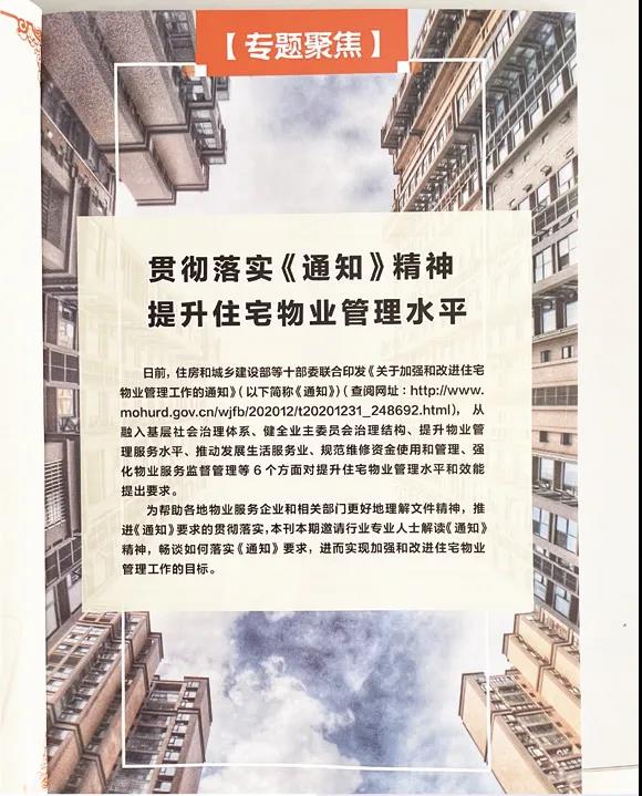 2021年1月5日,住房和城乡建设部等十部委联合发布《关于加强和改进住宅物业管理工作的通知》(以下简称《通知》),杂志围绕“贯彻落实《通知》精神 提升住宅物业管理水平”进行专题组稿,邀请业界专家解读《通知》内容,分析《通知》精神,并报道了一批品牌物业服务企业在贯彻落实《通知》精神方面的先进经验和具体做法。这一专题报道对助推行业贯彻落实《通知》精神,推动行业实现高质量发展发挥了重要作用。