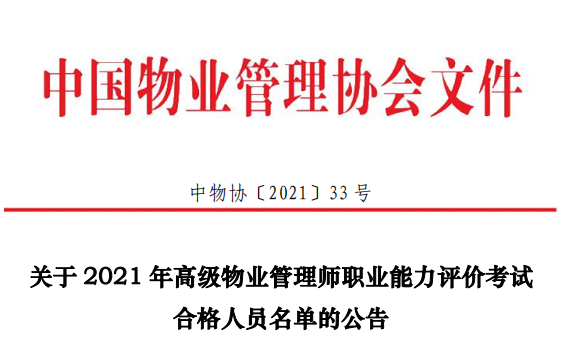 根据《物业管理员(师)职业能力等级评价管理办法(试行)》《物业管理员(师)职业能力等级评价实施细则》规定,经公示和审核,现将2021年高级物业管理师职业能力评价科目一案例分析考试合格人员名单予以公告。