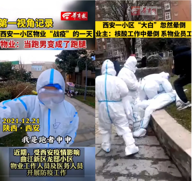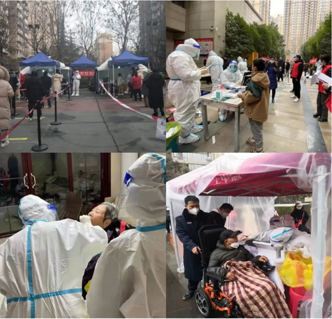 保利物业陕西公司在西安市下达全员核酸检测通知后,物业管家第一时间做好信息发布,并协助开展核酸检测工作,封城第一天协助完成两轮全员核酸检测工作,累计检测业户人数30000余人。金辉物业自12月23日自管控升级以来,保洁、秩序队员、绿化师傅等全部取消休假,全员投入防控一线,通宵达旦、全力以赴,配合开展核酸检测,截至12月26日金辉物业西安市全体项目累计协助核酸检测142750人次。天朗物业为确保核酸检测的高效率进行,提前规划好小区各单元的具体检测时间,引导组在对应时间通过线上云管家提示,线下大喇叭广播等形式,确保人人按时按安排进行核酸检测工作,累计协助完成3轮核酸筛查采样工作,共计超380000人次。志诚物业、新兴物业、广瑞物业针对个别老年人行动不便,配合核酸检测人员采取上门采集,提供轮椅服务等方式,确保小区全员完成核酸检测任务。