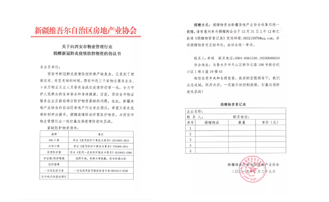全国物业一家亲,一方有难,八方支援。为帮助缓解当前西安市物业管理行业防疫物资短缺的局面,并向一线物业服务人员表达关心和支持,新疆房地产业协会立即安排专人购买部分防疫物资,并及时向全体会员单位发出《关于向西安市物业管理行业捐赠新冠肺炎疫情防控物资的倡议书》希望大家在危难时刻伸出援手,捐赠疫情防治所需N95口罩、外科口罩、医用防护服、防护面罩、一次性乳胶手套、红外枪式体温检测仪等物资,与西安市物业管理行业一起同心抗疫,共克时艰。
