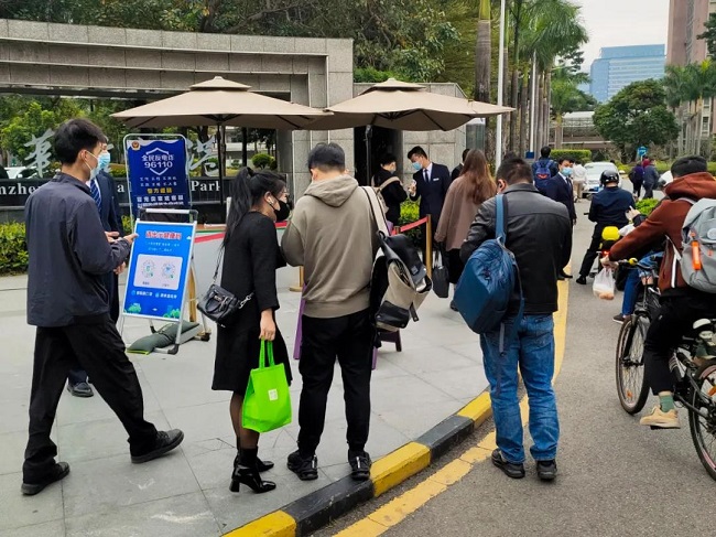 2022年1月7日,深圳市新增2例确诊病例。力合物业清华信息港物业服务中心迅速开展紧急状态下的疫情防控工作,物业服务中心积极了解防疫政策,结合深圳市新冠疫情防控指挥部最新防疫工作要求及松坪山社区全员核酸检测的通知,有序组织员工进行全员核酸检测,并通过微信群、公告栏、登门拜访等方式通知园区企业进行核酸检测,告知附近免费核酸检测取样点及取样时段,方便园区企业员工尽快接受核酸采样。