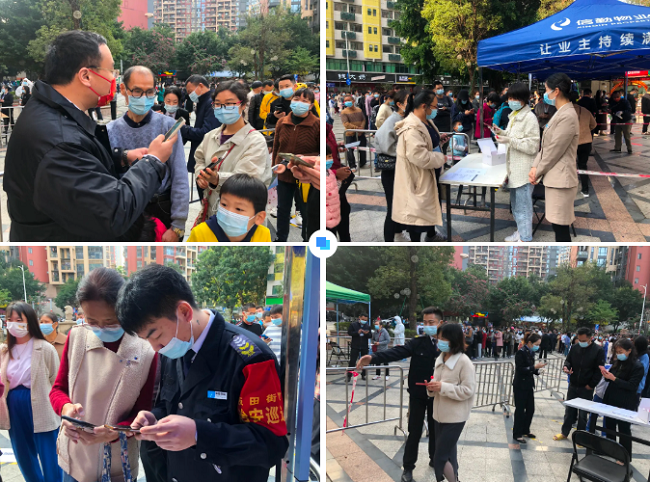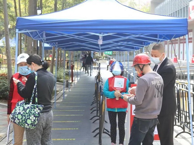为多方位保障核酸检测工作安全、有序、高效完成,华南分公司物业工作人员连夜搭建帐篷、设置13个核酸检测点,配备酒精、口罩等防疫物资;通过入户宣传、微信群消息等方式动员广大小区业主、住户配合核酸检测,确保全民核酸检测应检尽检;在检测现场,协助核酸检测采样小组引导现场人员有序扫码登记、排队,并耐心解答他们的问题,同时,为体弱多病、孕产妇、独居老人等特殊群体开通绿色通道。