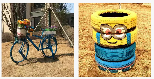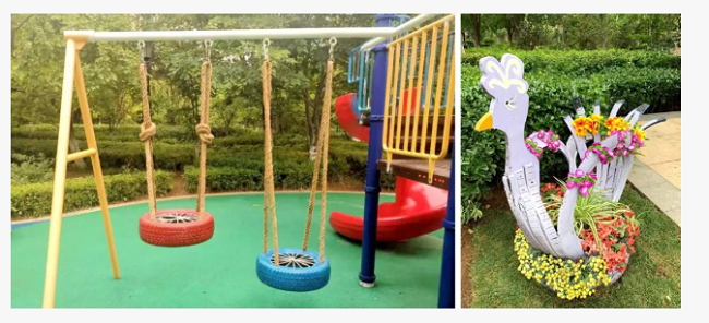 案例描述:在社区公共活动场所内实施“轮胎美化改造”。使用废旧汽车的轮胎代替传统的秋千座椅,夏天透气通风,冬天轮胎橡胶不会冻手;通过收集小区业主闲置或汽车修理厂废旧的轮胎,组织业主活动,自制DIY装饰性雕塑。