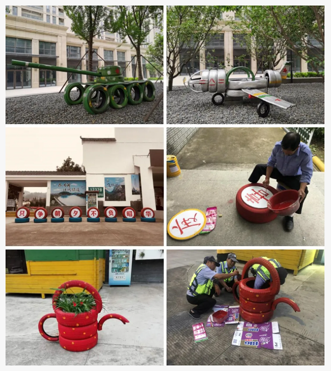 解决问题:解决了社区内废旧汽车轮胎的处理问题,变废为宝的同时,为社区增添了一道亮丽的风景线;提升园区环境观赏性及趣味性,丰富孩子们游戏空间。