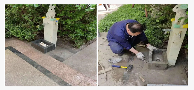 案例描述:因园区内经常有老人带领儿童玩耍、下棋、聊天等,结合疫情管控,洗手节水装置方便儿童及老年人玩耍后及时清洁。为节约用水,正面采用按压式水龙供业主使用,侧面保洁取水点采用钥匙水龙头;废水将排入绿化内浇灌草坪树木。既方便业主使用,又减少了绿化工作量,提升了业主满意度。