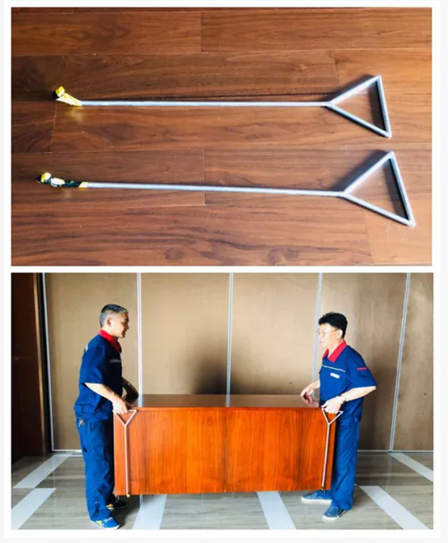 案例描述:会议桌通常没有抓手设计,根据会议类型调整桌椅时搬运困难,不仅需要大量人力,还容易损坏桌椅,影响服务效率。项目部亲自设计搬运辅助工具并手工制作不锈钢材质搬运辅助工具,工具底部也用塑料胶布包好以免搬运时损坏桌椅,结构设计更为便利、操作使用更具人性化。