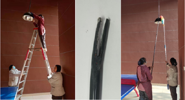 案例描述:制作外形类似于鸭嘴长杆,配以毛巾卡入灯罩,以免损伤灯罩表面。可实现直接于地面操作,一人用鸭嘴杆固定住灯罩,另一人可用鸡毛掸掸灰尘。可节省搬运人字梯时的劳动力,同时也消除上下梯时的安全隐患。