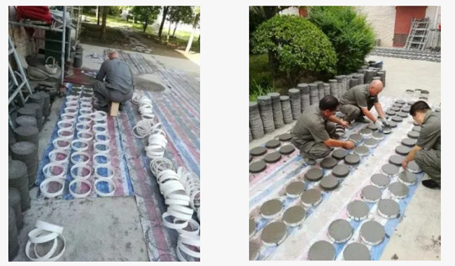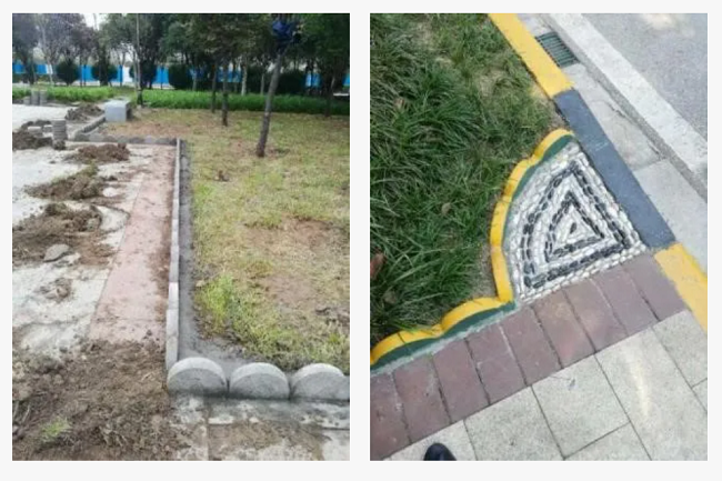 案例描述:前期准备——白色塑料水管切割成圆片型模具(厚度4cm,直径20cm),模具边口用黄沙打磨光滑;中期实施——拌匀混凝土:1份水泥+2份最小的小石子+3份黄沙;模具内浇筑混凝土,抹平;夏季一般2小时即可脱模,第二天浇水养护,三天后可用于施工;水泥圆片竖向埋入地下约6-7cm,地面留2/3;带线施工,统一高度、直度、平整度;后期美化——根据周边环境景观,调配油漆颜色、图案。