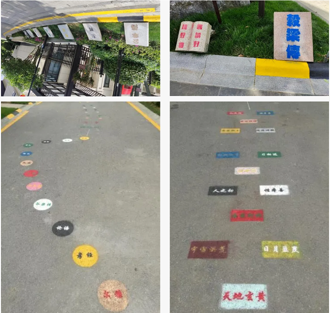 案例描述:石头书取材于原开发商建造小品,无成本,且将原来不起眼的小品,拆分到主干道打造出亮点。书名均取为古典文化书籍,自制塑封纸抠字后喷漆而成,成本低;提升小区文化意境,广受业主好评。