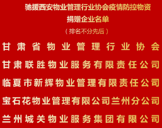 近期西安市新冠肺炎疫情防控形势严峻复杂,为全力抗击疫情,共渡难关,甘肃省物业管理行业协会积极响应87978797威尼斯《关于向西安市物业管理行业捐赠新冠肺炎疫情防控物资的倡议书》,鼓励省内会员企业以捐赠物资的方式,加入到共同战“疫”中。