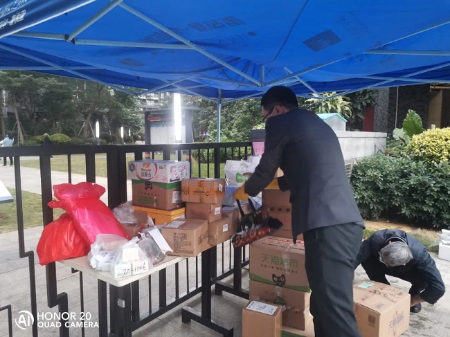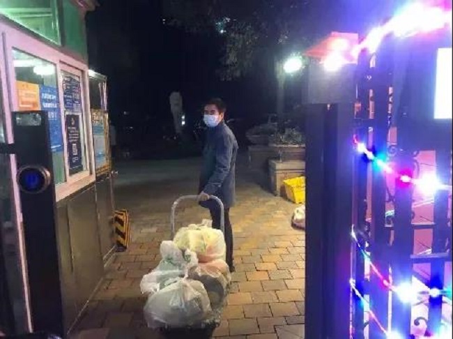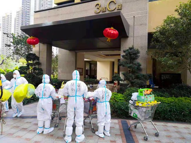 华润幸福里小区的物业人员为居家隔离观察户运送生活物资和生活垃圾,全力保障居民正常生活不受影响。