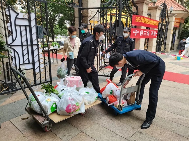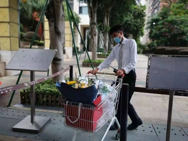 中海物业人帮助居家隔离的居民运送生活物资和快递。
