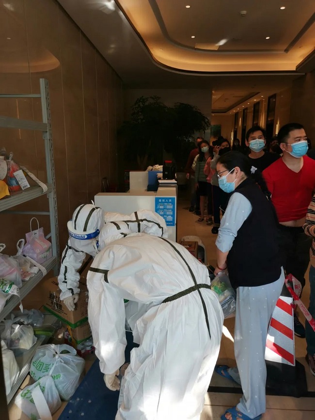 鸿荣源物业人员为熙龙湾二期封控楼栋住户配送生活物资,保障住户日常需求。