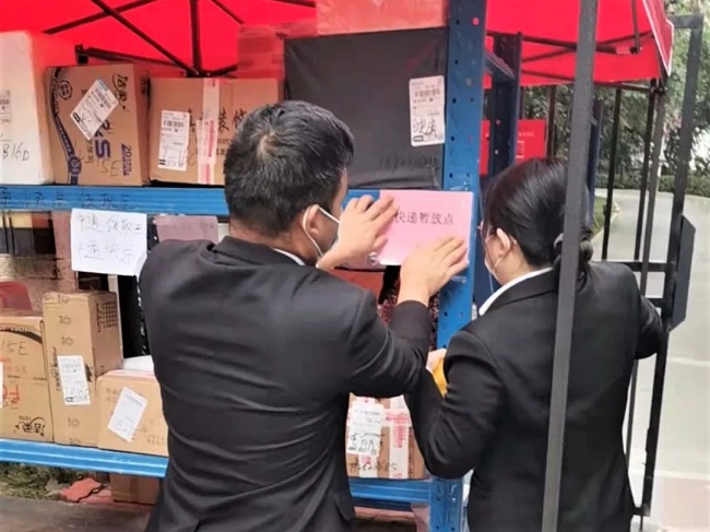 疫情期间,快递无法进入小区,吉祥服务在管的各小区物业人员第一时间搭建快递存放点,分栋存放业主快递,并由楼栋管家送上门去,尽可能减少业主与外界接触。