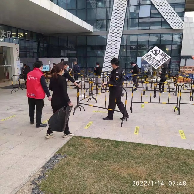1月14日早上7点,深福保物业人在紧锣密鼓的搭建核酸检测场地。