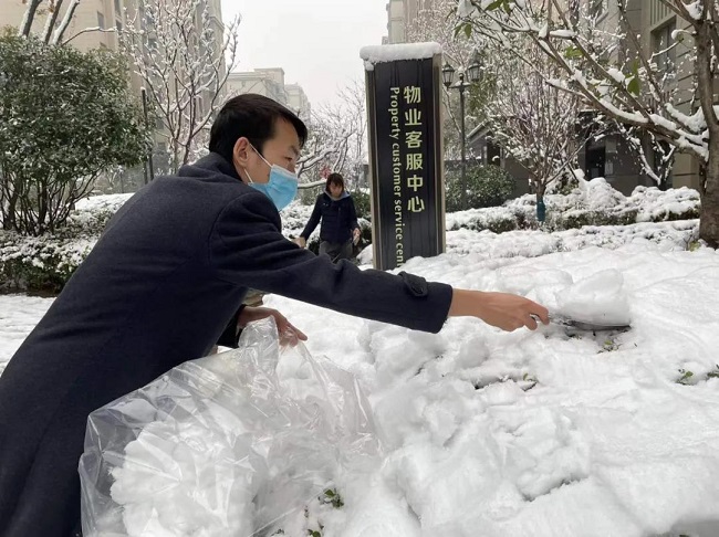 1月4日的郑州,伴随着初雪一起降临的,是又一轮爆发的疫情。管家王圆飞所在的正弘•澜庭叙项目,一夜之间居家隔离了几十户业主。就在王圆飞布置第二天的核酸检测现场、准备所需物资、分批通知业主的时候,他收到了一个特殊的微信:“圆飞,你能帮个忙吗,孩子想摸摸雪……”原来,隔离在家的一名小业主因太想玩雪急得大哭,业主实在哄不住嚎啕大哭的小朋友,这才想到了尽职尽责的管家王圆飞,向他提出了求助。深夜还在做核酸检测准备工作的王圆飞立刻回复道:“明天一大早,我一定把雪给孩子送到!”第二天天一亮,王圆飞就找来了袋子,装了满满的积雪送了过去。然后,他又飞快地跑到核酸检测的现场,搬桌子、拉警戒线、编号通知、维护秩序……连续工作了12个小时,也站了12个小时,他的腿僵硬了,嗓子也哑了,但这时他却收到了业主特意发来的视频:小朋友终于玩到了心心念念的雪,开心得咯咯笑。王圆飞说,看着孩子灿烂的笑脸,就不觉得累了。