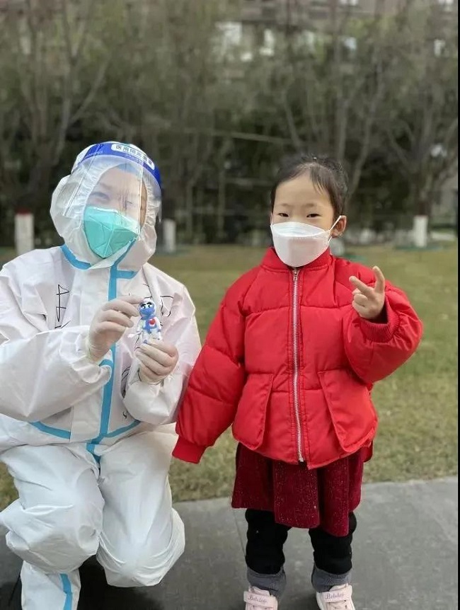 时间一点点过去,漫长的队伍一点点缩短。她的眼镜升起了雾气,手也越来越酸,室外气温只有1摄氏度,她背上的暖贴和腿上的热水袋透过防护服,透过冬装,给她温暖与力量。距离开始做今天第一个核酸,已经过去了快5个小时,“没有人来了,可以结束了” , 她活动了一下酸痛的肩膀,开始收拾散落地上的垃圾。“我来帮你”,物业工作人员心疼地说。她摆摆手:“没事,这个是医疗垃圾,你们不要接触,我来收拾。”本轮核酸结束了,跟同事互相做核酸,封管,脱下防护服,消毒,迈着沉重的步伐回医院。在路上,她笑着将照片一一编辑好,发了一条朋友圈:“小朋友送的暖贴,志愿者送的热水袋,居民的无数句谢谢,都在使这个冬天不再寒冷。”那些疲惫,那些辛苦,她一点也没有提及。