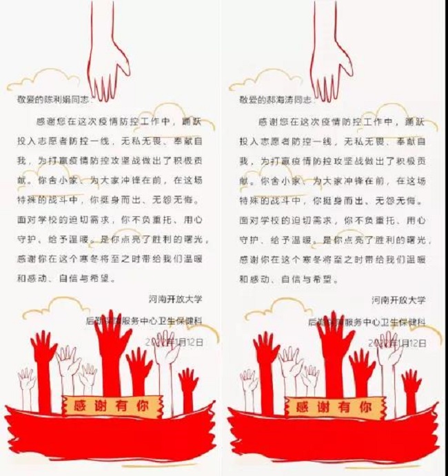在项目岗位上加班加点、日夜不分的陈利娟和郝海涛同志,在防疫战开始的时候,无私奉献,踊跃投入志愿者防控一线。舍弃小家,先为大家,在项目需要的时候,第一时间支援。为感谢他们为疫情防控作出的贡献,项目方送来了感谢信。他们是寒冬里的一束暖光,点亮了黑夜,温暖了人心。