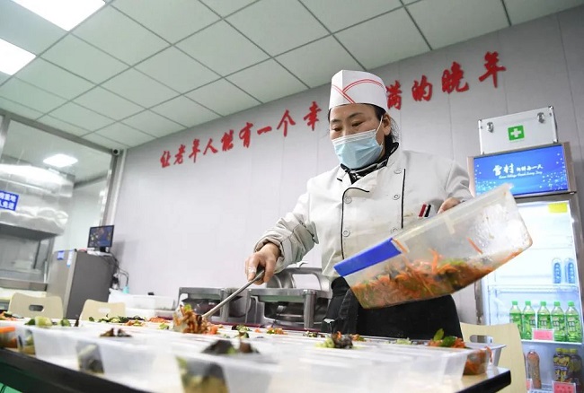 河北省承德市滨河社区老年食堂工作人员在为老人配餐(2021年12月16日)。