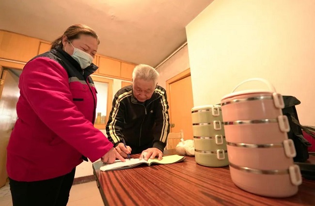 河北省邢台市康宁智慧社区养老服务中心工作人员(左)把午餐送到檀成海老人家中(2022年1月6日)。