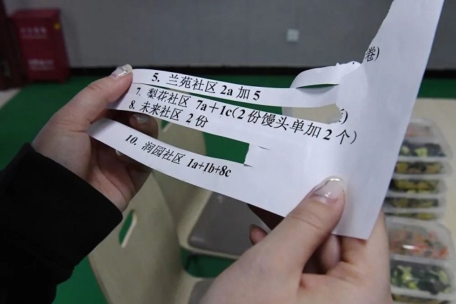 河北省承德市滨河社区老年食堂工作人员查看送餐单(2021年12月16日)。