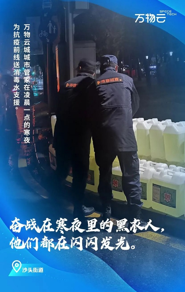 2月23日凌晨2点,万物云城工作人员在寒夜中使用大型水车对沙头街道主干道进行科学消毒。在政府的引领下,万物云城深圳城市服务管理部召集四个街道的员工共同在恶劣环境中冒雨抗疫,消毒动作专业有序,快速推动各项防控工作,构筑起疫情防控的人民防线。黑夜中,他们时刻体现着万物云城抗疫之高效——“快、严、扩、足”的概念,一个个“抗疫先锋”的缩影充分展现了万物云携手同行、共同抗疫的硬核力量。