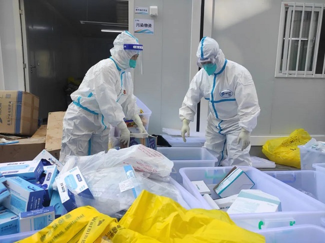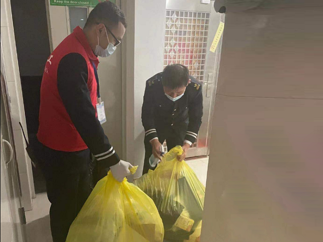明喆集团北中医深圳医院物业人员在处理废弃的防疫物资。深圳疫情形势严峻,每日防疫物资用量剧增,明喆物业后勤人员轮班处理已使用、受污染物品,避免造成交叉感染。