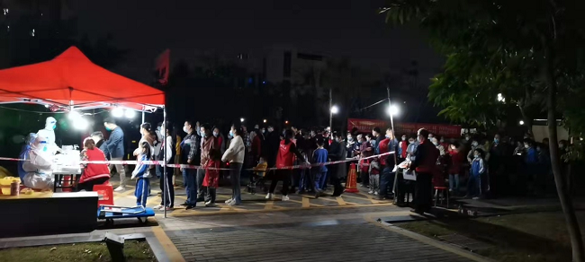 各个核酸检测采样点前,业主们佩戴好口罩,在工作人员的指引下有序排队。有序的背后,是中海物业人拿着一米线格式刷在夜幕之下 天亮之前把所有的小区都“刷”了个遍。