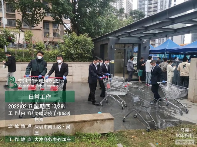 近期,深圳疫情先后多点爆发。2022年2月16日,接深圳市南山区疾控中心通知,大冲城市花园片区临时管控。深圳保利物业在管项目-大冲商务中心,紧邻本次疫情管控区,项目有近一半的物业工作人员被隔离。在严格遵守疫情防控的要求下,被隔离的深圳保利物业工作人员从隔离者化身志愿者,他们尽己之力服务群众,积极配合社区防疫工作,为城市花园居民配送补给物资。