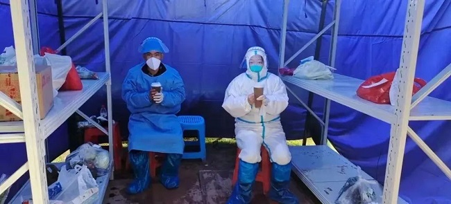 在项目防控现场,自凌晨便通宵忙碌不停的深圳招商物管工作人员们,分小组轮番坚守岗位,严守疫情防控防线。累了乏了,也仅在草地上临时铺个垫子、放个椅子,或在小区石凳和衣而卧。
